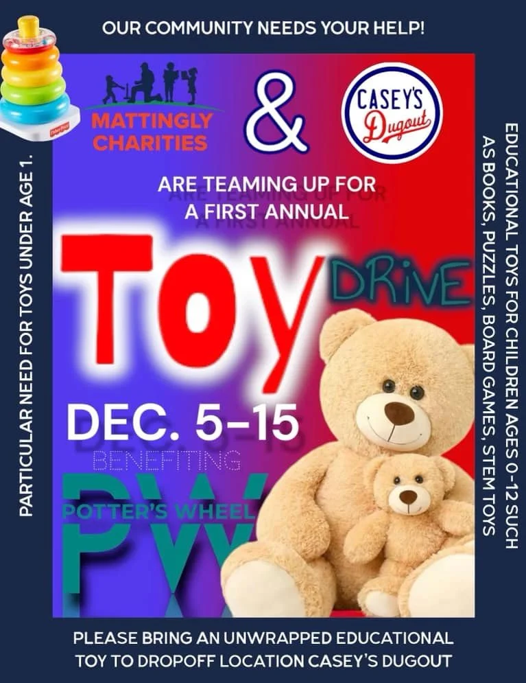 We have teamed up with Casey’s Dugout for a Toy Drive! We are seeking unwrapped toys, and educational gifts such as puzzles and books. Gifts will be delivered to Potter’s Wheel, an amazing organization here in Evansville who supports families in need. Items can be dropped off at Casey’s Dugout during business hours (5pm-10pm CT) through December 15th.